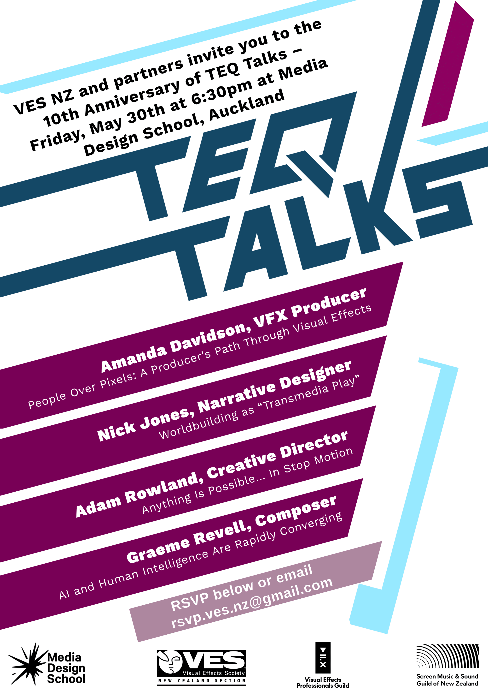 The Visual Effects Society of NZ, VFX Guild of NZ, Media Design School, and the Screen Sound and Music Guild invite you to our first Auckland TEQ Talks — fascinating short talks by innovators & creatives from VFX, sound, animation and beyond, about the topics they’re most passionate about.